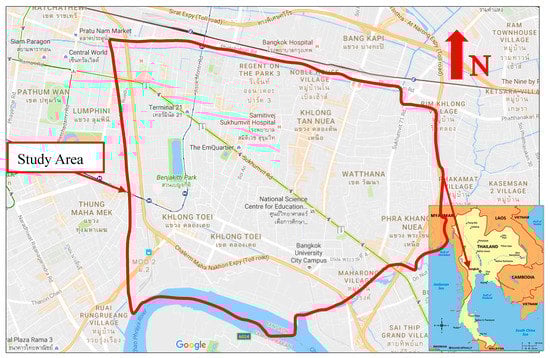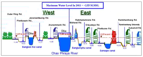 The case study area is located in the eastern part of Bangkok, which is a part of the central business and commercial districts. The geographical location of the Sukhumvit area is 13°44′18.01″ N latitude and 100°33′41.31″ E longitude. The elevation of the study area is between 0.4 m and 4 m above sea level. The area falls within two districts of Bangkok, namely Wattana and Khlong Toei, with a total population of 185,275 inhabitants []. Terrain elevations along Sukhumvit Road are approximately equal to sea level and below the Chao Phraya River, which makes the area, besides frequent pluvial floods, also vulnerable to fluvial and coastal floods; see Figure 3 and Figure 4.