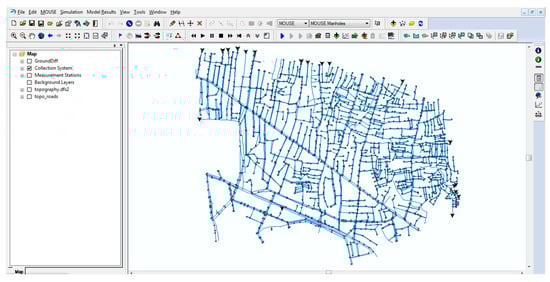 The model used (is derived from two events from 2002 (one from 5 October and one from 7 October) had been calibrated in a previous study []. For the events of 2002, in addition to the rainfall data, time series water level measurements in manholes and streets were recorded at two locations in the Sukhumvit. The same study area and information have been used to calibrate and validate the model presented in []. In that particular study, a coefficient of determination was used for calibration purposes, and the values obtained were greater than 0.90 (see []).