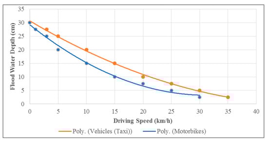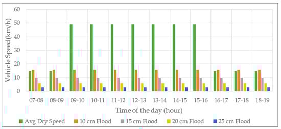 The data presented in Figure 9 and Figure 10 are taken from Soi Sukhumvit 39, Soi Sukhumvit 63 and Soi Sukhumvit 71 and along the main Sukhumvit Road. Figure 9 shows that the driving speed during rush hours (07–09 and 16–19) in dry conditions is almost identical to the driving speed when flood depths of 10 cm occur in the same timeframes. This implies that the driving speeds during rush hour are akin to that of perceived safe driving speeds in flooded conditions where the water level on the road is at a 10-cm depth. In contrast, outside of rush hour traffic, there is a significant difference between dry and wet driving speeds.