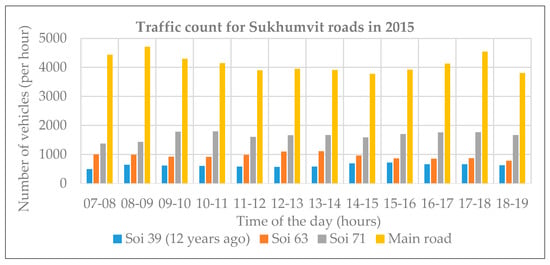 Figure 12 shows that during the peak hours, a floodwater depth of 10 cm does not result in any delays cost. This is because the average driving speed during the peak hours for dry conditions is almost the same as the average driving speed for an event of 10 cm of flood water. As losses are calculated per hour, for the floodwater durations of less than one hour, the respective duration fraction should be multiplied by the monetary values applicable to that particular hour. The difference in cost ranges for each road for different times of the day, and it also depends on the traffic congestions, as well as on the effective length of the road or traffic. For situations where the floodwater depth is 30 cm and higher, it is assumed that the road will be closed completely, and subsequently, all users will be affected. The traffic count used in the analysis did not consider motorbikes, although the estimated affected population, which is five people per vehicle, might have considered them instead of cars. The average speed of about 49 km/h is considered for off-peak hours according to the interview data and an average speed of about 15 km/h for peak hours (in accordance with the Traffic and Transportation Department (TTD) of Bangkok Metropolitan Administration (BMA) database obtained for the period 2011–2015 for Sukhumvit area).