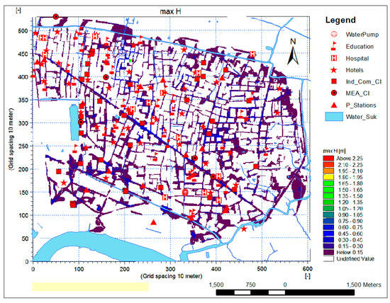 The use of numerical models is invaluable for the identification of flood-prone areas and quantification of hazards [,,,,,,,]. Although the use of numerical models is nowadays a standard practice for many flood specialists, the ability to produce reliable results still poses a considerable challenge to researchers and practitioners. This relates to the selection of data pre-processing and post-processing techniques, as well as to the selection of the most suitable modelling system and modelling approach for the problem at hand (see, for example, [,,,,]. The present work uses 1D–2D models within the MIKEFLOOD modelling environment for estimation of hazards; see Figure 5. The 1D–2D coupled model consisted of 3487 manholes and basins and 3858 pipes, with the total drainage area corresponding to 2048 ha. Flood hazards are quantified mainly on the basis of floodwater depths since the local topography is rather flat, and this hazard variable is regarded as the most dominant for the pluvial type of flooding, i.e., changes in the flood velocity are negligible compared to the changes in floodwater depths (see, for example, []). The rainfall event used in the analysis is a 100-year return period event [].