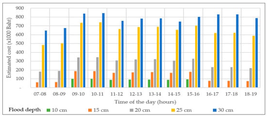 The Department of Traffic and Transportation (DTT), in Bangkok data (Figure 12) consists of all vehicle types including motorbikes, cars, vans and passenger busses. To represent vehicles as the number of people, we assume five passengers per vehicle. During office hours, we make the additional assumption that the delay time corresponds to 100% loss of average (per capita) hourly income. An overview of the quantification (i.e., estimation of costs) of delay for different floodwater depths taken at different hours for Sukhumvit Soi 71 is given in Figure 12.