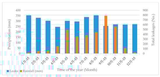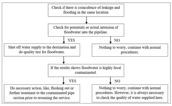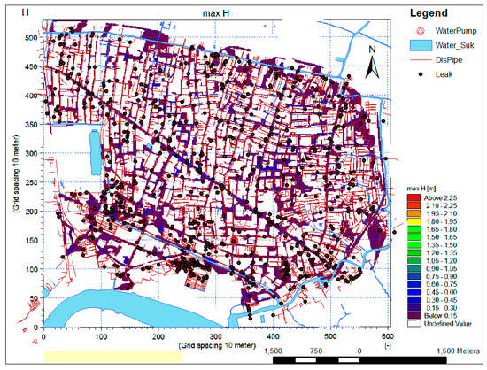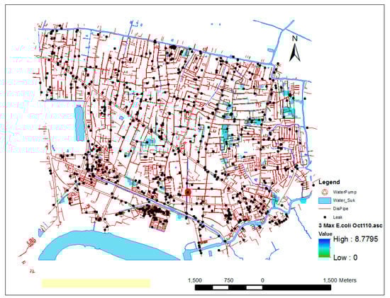 The present study also addressed the possibilities of floodwater intrusion into the water supply system and contamination during the intermittent water supply periods. Water supply pipe leakages in Sukhumvit (Figure 13) range from five hundred to eight hundred leaks per month. Furthermore, the official announcement of MWA (http://gisonline.mwa.co.th/GIS1125/index-desktop.php) shows numerous instances of intermittent water supply for operational and maintenance purposes, which carry the risk of floodwater intrusion into the water supply system (e.g., in September 2016, there were 1472 cases of this nature; in October 2016, there were 873 cases; in November 2016, there were 987 cases, etc.). Figure 14 depicts the locations of leakages in relation to flood-prone areas, and Figure 15 depicts the locations of leakages in relation to potential Escherichia coli concentrations in the floodwater (see also []). These two figures were obtained from the results of the 1D–2D model simulations.
