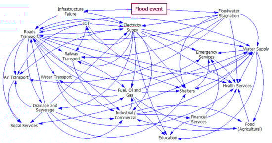 Our efforts to understand cascading effects from disasters, and particularly natural disasters, have grown considerably over the past decade, and this subject matter has evolved into an emerging field of scientific research []. Attempts to develop frameworks and methodologies for the analysis of flood-related impacts are gaining particular importance in view of continuous devastation posed by such disasters. Traditional efforts are primarily concerned with assessment of direct and immediate impacts or damages, and efforts are being made to capture their indirect or cascading effects (example [,]). The importance of expanding our research into cascading effects comes from the fact that in many cases, such effects have the potential to exceed the magnitude of direct or immediate damages. A typical example is that a floodwater depth of 25 cm may cause little or insignificant direct damage, but at the same time, it can cause serious public health issues if it is mixed with wastewater, as well as the disruption of power and water supply, which can in turn lead to further complications and losses (see, for example, [,,,]).