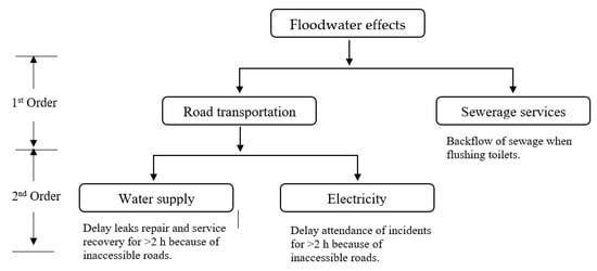 Cascading effects from floods on critical infrastructure services can be such that a critical infrastructure service that is not flooded at all is affected as a result of another infrastructure affected by floodwater. For example, repair work on the water supply network can be delayed due to the flooding of roads that provide access to the affected parts of the network. Another example is the situation when food stores incur losses from flooded roads and the inability of customers to reach their premises. Therefore, indirect losses can occur inside and outside the flooded area [,]. However, Merz et al. [] (2010) argue that indirect economic damages of natural disasters can be negligible if very broad temporal and spatial extents are considered.