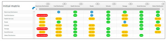 Besides the above means, the present work also applies the commercial HAZUR software (http://opticits.com/) aimed at exploring measures to enhance resilience in cities. The example given in Figure 19 shows a typical donor to receiver matrix that the HAZUR software uses. Different colours in the matrix show different messages. Red means that the receiver service will stop its operations; yellow means a reduced service; and green means that it is not affected (i.e., normal operations).
