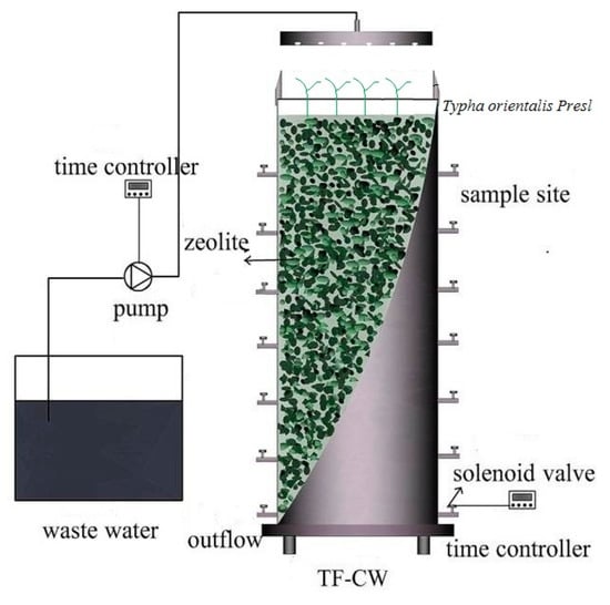 The TF-CW simulator (Beijing, China) used in this study was a cylindrical steel drum, 110 cm high, with a diameter and volume of 40 cm and 138 L, respectively (Figure 1). The device had 21 sampling ports, each with a diameter of 1 cm. These ports were equally spaced around the device in seven rows that were arranged at 15-cm intervals from the top to the bottom. The inflow water was controlled by a water pump that was monitored by a time controller (TB-125, LUEABB, Wenzhou, China). The device was covered with a sprinkler cover that had small holes on its bottom to ensure uniform water flow. The effluent water was controlled by electromagnetic valve (2 W normally closed 220 V, LUEABB, Wenzhou, China) and was monitored by a time controller. Zeolite, with a particle size of between 4 and 8 mm and a porosity of 42%, was filled into the device to a height of 105 cm. The zeolite was planted with Typha orientalis.