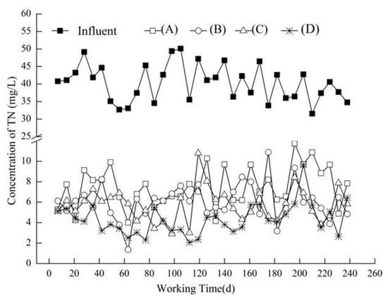 Removal rates of total nitrogen (TN) in the four different devices (A–D).