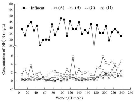 The NH4+-N concentrations in the effluent were statistically significantly lower than those in the influent (Figure 3). The NH4+-N removal rate was higher than 90% and the removal efficiency was greater than that of TN. The removal efficiency of NH4+-N in the tidal flow constructed wetland exceeded 98%, and the NH4+-N removal rates were significantly different between the four influent conditions (p < 0.05) (Table 3).