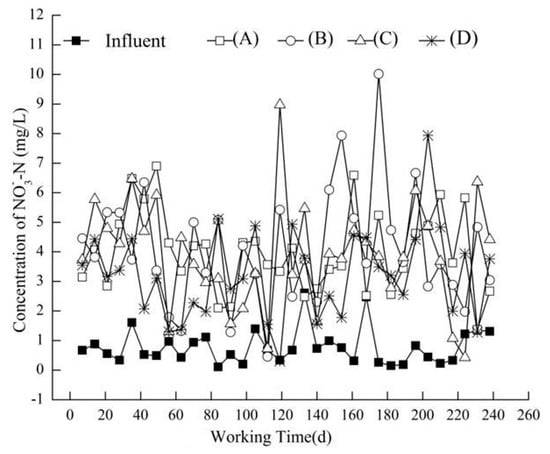 The NO3−-N concentrations in the effluent were higher than those in the influent from the four simulations, mainly because of NO3−-N produced during reactions. The removal rates were negative and the difference between the inflow and outflow concentrations in the continuous flow setting was greater than the difference between the inflow and outflow concentrations in the tidal flow simulation devices (Figure 4).