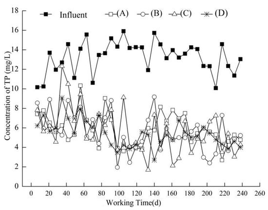Total phosphorus (TP) removal rates in the four different devices (A–D).