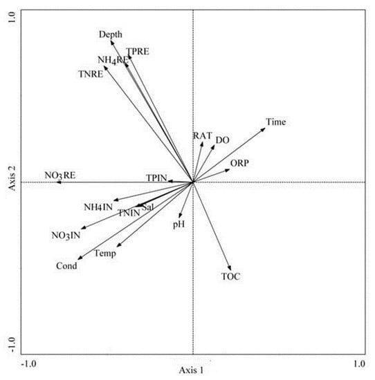 It is difficult to control the basic chemical transformations in ecological engineering applications, and pollutant recycling in wastewater is a highly complicated process. There is considerable variation in the many factors that influence the removal efficiency of different pollutants, and it is impossible to consider the wide range of potential influences as model inputs. In this study, we used redundancy analysis (RDA), based on the actual effluent concentrations, to screen each of the indicators for their influence on the removal efficiency of nutrients in the TF-CW simulator (Figure 7). Redundancy analysis can extract and summarize the variation in a set of response variables that can be explained by a set of explanatory variables. It can also be considered a constrained version of principal components analysis (PCA), where the canonical axes—built from linear combinations of response variables—must also be linear combinations of the explanatory variables [25].