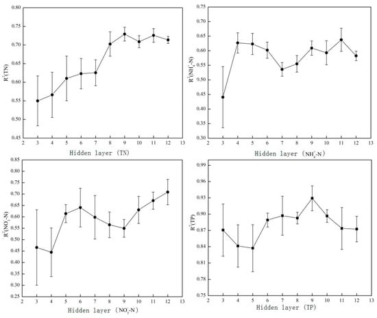 Figure 8 shows that the number of nodes increased as the number of hidden layers increased, and there was a clear increase in the R2 of TN when the number of hidden nodes was 9. The training effect was best when TN had 9 hidden layers. The R2 value reached 0.73 ± 0.02, gradually stabilized, and then decreased slightly. For NH4+-N, when the number of hidden nodes increased from 3 to 4, the training effect improved noticeably, but then the coefficient of the hidden layer started to fluctuate as the hidden layer nodes increased. When the number of hidden nodes reached 11, R2 was maximized and reached 0.63 ± 0.04, which was less than the value for the TN training data. When training the NO3−-N data, the effect of the training data increased when the number of nodes in the hidden layer increased. We chose to use 12 hidden layer nodes in the NO3−-N network topology, and achieved an R2 of 0.71 ± 0.06. For TP, there was no obvious change as the number of nodes in the hidden layer increased. The overall R2 was high, and reached 0.93 ± 0.02 when the number of hidden nodes was 9. We therefore used 9 hidden layer nodes when predicting the TP effluent concentrations.