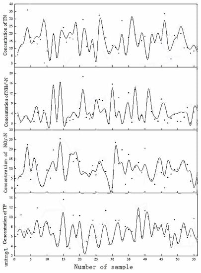 The above three figures (Figure 11, Figure 12 and Figure 13) show that the quality of the fit of the BP neural network differed for each of the three nitrogen forms. Although there was a large relative error associated with the NH4+-N fitting, it fitted better to the network than the other two nitrogen forms. Therefore, when using BP neural networks, we should not just consider the network error or the percentage network error, but we should also consider the network fitting ability.