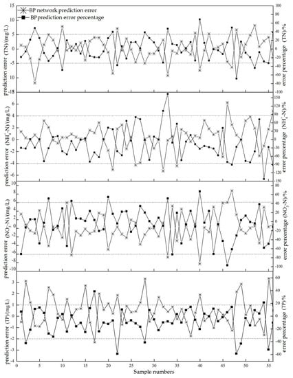 There were some errors in the effluent concentrations of each index predicted by the BP neural network. The network prediction error percentage and the prediction error fluctuated significantly (p > 0.05). By comparing Figure 9 and Figure 10, we find that, when the measured value was high, the error in the predicted value was very obvious and the prediction percentage error was large; when the measured value was low, the network prediction error and the percentage network prediction error were both low. When there was no functional relationship between the training data and the verification data, the BP neural network had a poor predictive ability, and the network only performed well when the data were regular. The network prediction error in the TN effluent concentrations ranged from −15 to 15 mg/L, and, with 80% of the prediction error between −5 and 5 mg/L, the overall network error was small. The error associated with the predicted NH4+-N effluent concentrations ranged from −8 to 8 mg/L, and 90% of the predicted error was between −4 and 4 mg/L. The obvious variations and the high relative errors resulted from the low effluent concentrations. The errors associated with the predicted NO3−-N effluent concentrations were mostly between −6 and 6 mg/L. The results suggest that the BP neural network was better at predicting the effluent concentrations of TP than the other nutrients since the errors associated with the predicted TP concentrations were small and 90% of the TP prediction errors were between −2 and 1 mg/L.