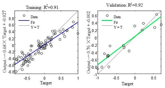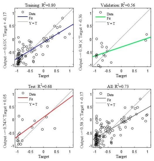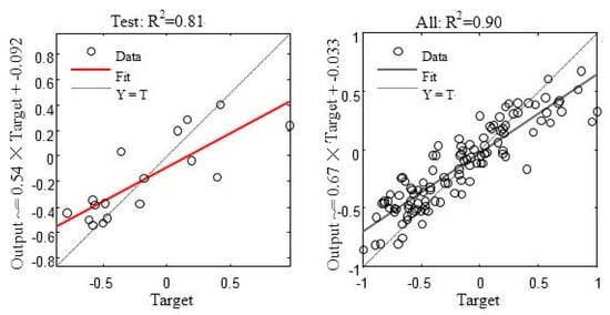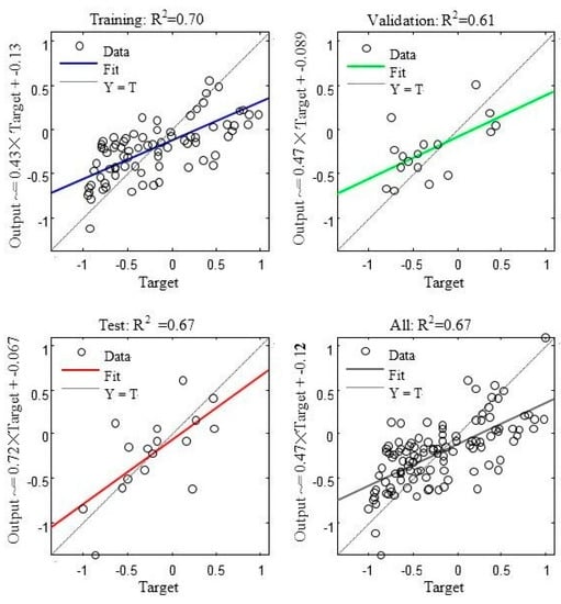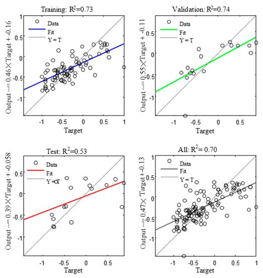 The fitting ability of the network is an indication of how well the constructed BP neural network fits to the topological structure. The data were automatically divided into training data, validation data, and test data during the training and prediction. When calculating the fit between the measured and output values of each data, the R2 represented the fitting effect, the fit line represented the fitting curve, Y = T represented the fitted line when R2 = 1, and the degree of fitness decreased as the deviation increased.
