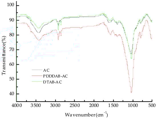 The AC, DTAB-AC, PDDDAB-AC SEM images are shown in Figure 1. Compared with those figures, the surface of the activated carbon was changed obviously under the influence of the modifier. Figure 1a is the unmodified activated carbon, which has a smooth and regular surface and dense structure without a gap. Under the modification of DTAB and PDDDAB (Figure 1b,c), the activated carbon exhibits a rough surface and a large number of cavities.