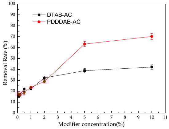 Activated carbon, modified by 7 different concentrations (0.1%, 0.2%, 0.5%, 1%, 2%, 5% and 10%) of PDDDAB/DTAB respectively, were weighed with precision of 0.5 g into 7 reaction bottles, with a 50 mL sample of solution. The concentration of chromium in the solution was determined after shaking for 7 h on the shaker at the room temperature. Figure 4 shows the removal rate changes with the modifier concentration. As the concentration of the modifier increases, the removal rate of Cr(VI) in the raw water increases. Due to the hydrophobic interaction between activated carbon and modifier [26], activated carbon has a strong ability to fix PDDDAB and DTAB. Studies have shown that anion exchange and electrostatic adsorption are the main adsorption mechanisms for cationic surfactant-modified activated carbon [27]. The reaction can be described by the following reaction equation: when the concentration of modifier and the removal rate of chromium by modified activated carbon are higher, the removal rate of activated carbon to modifier is higher. When the carrying capacity reaches the maximum, the removal is in a steady state. In the experiment, when the maximum load was selected, the concentration of the modifier was 10%.
