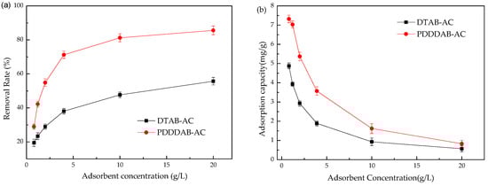Samples of modified activated carbon 0.04g, 0.06g, 0.1g, 0.2g, 0.5g and 1g were weighed precisely into 6 reaction bottles, with a 50 mL sample of solution. The concentration of chromium in the solution was determined after shaking for 4 h on the shaker at the room temperature. According to Figure 5, with the increase of the adsorbent concentration, the removal rate of chromium increases (Figure 5a) and the adsorption capacity of chromium decreases from the initial chromium concentration (Figure 5b). As the concentration increases it reaches a concentration where the adsorption tends to be balanced, and PDDDAB-AC chromium removal rate is much higher than the DTAB-AC. The effect is due to that with the increasing adsorbent dosage, the total number of adsorption sites increased, which allowed the removal rate to increase. When the volume and mass concentration of Cr (VI) solution remain constant, increasing the adsorbent concentration will increase the amount of adsorbent in the unsaturated state [28], so that the total adsorption capacity appears to decrease. It can be seen from Figure 5a that PDDDAB-AC provides higher capacity for the adsorption of Cr (VI), and consequently has better adsorption effect.