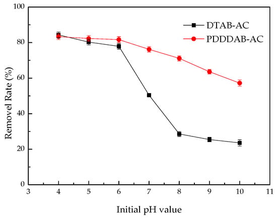 A series of 0.5 g samples of modified activated carbon were weighed into 6 reaction bottles with 50 mL sample solution and the solution pH value was adjusted to 4, 5, 6, 7, 8, 9, and 10, using hydrochloric acid and sodium hydroxide (1:1 v/v). The concentration of chromium in the solution was determined after shaking for 4 h on the shaker at the room temperature. As shown in Figure 6, the removal rate for chromium decreases as the pH increases and this phenomenon is not obvious under the acidic conditions, but significant under alkaline conditions. The PDDDAB-AC has less of an effect than DTAB-AC and adapts to pH change. It has its highest removal rate at pH of 4–6 in this study.