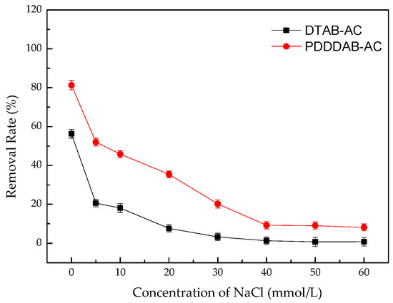 Samples of 0.5 g modified activated carbon were weighed into 6 reaction bottles with 50 mL solution sample and concentration of NaCl in solution was 0 mmol/L, 5 mmol/L, 10 mmol/L, 20 mmol/L, 30 mmol/L, 40 mmol/L, 50 mmol/L, 60 mmol/L. The concentration of chromium in the solution was determined after shaking for 4 h on the shaker at the room temperature. According to Figure 7, the effect of ionic strength on the adsorption of chromium by two kinds of modified activated carbon is significant, the removal rate decreases significantly with the increase of ionic strength in the reaction solution, the removal rate of DTAB-AC and PDDDAB-AC were below 10% when the NaCl concentration was greater than 40–60 mmol/L, the presence of a large amount of Cl- ions in the solution produces a strong competitive adsorption with chromate ions and inhibits the adsorption of chromium [32]. This conclusion is in accordance with the statement that the adsorption of hexavalent chromium anions by modified activated carbon is based on the main mechanism of ion exchange and electrostatic adsorption. The ionic reaction formula is shown in Equations (1) and (2). Studies have shown that NaCl makes hexavalent chromium ions display a “salting-in” effect [13], so that the distribution of adsorbate in the solution increased. The presence of NaCl may agglomerate the adsorbent, resulting in a decrease in the number of adsorption points [33].