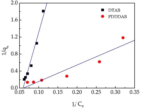 Langmuir adsorption isotherms of Cr(VI) onto PDDDAB and DTAB.