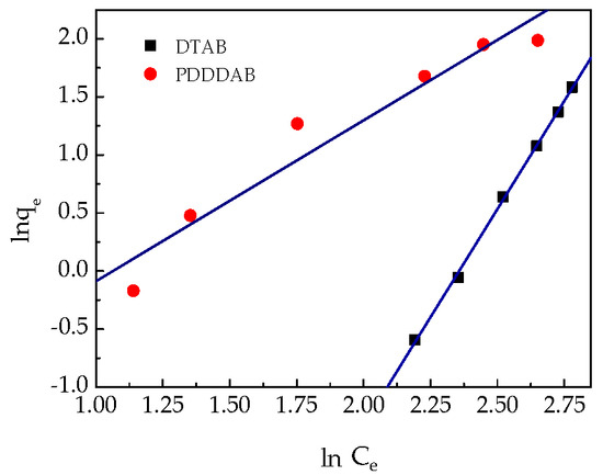 Freundlich adsorption isotherms of Cr(VI) onto PDDDAB and DTAB.