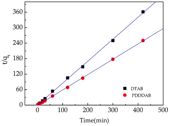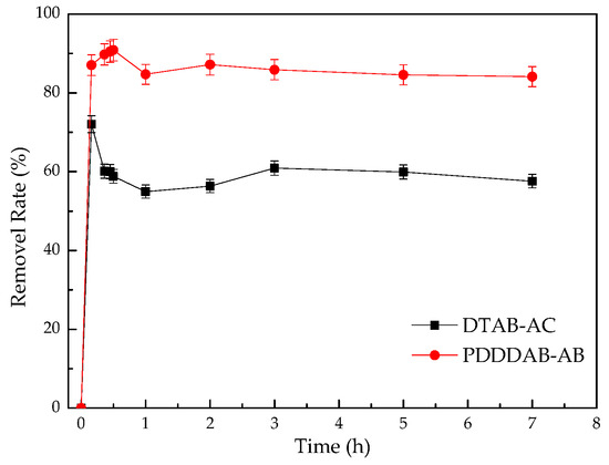 The kinetic experiments were carried out with 0.5 g DTAB-AC/PDDDAB-AC and 50 mL sample solution at pH 4. The concentration of chromium in the solution was determined repeatedly by sampling the reaction solution after shaking the shaker at room temperature over a 7 h period. The relationship between the adsorption time T and the chromium removal rate was plotted as Figure 10. From this figure, it was observed that DTAB-AC adsorption of chromium in the reaction achieved the maximum removal rate of 70% within 1 min, PDDDAB-AC adsorption of chromium achieved the maximum removal rate of 92% in about 30–60 min. Thereafter, the removal rate was found to be slightly decreased, which may be attributed to physical desorption of Cr(VI) from activated carbon. Finally, the curve of removal rate slowly tends to a smooth line. The final PDDDAB-AC removal rate falls from 92% to about 80%, DTAB-AC adsorption chromium removal rate falls from 70% to 60%. The rapid increase in removal at the initial period may be due to an increased number of vacant sites available at the initial stage, thus there exist increased concentration gradients between adsorbate in solution and adsorbate in the adsorbent surface. This increase in concentration gradients tends to allow rapid increase of Cr(VI) removal at the initial stages [39]. Although DTAB-AC achieves equilibrium in a slightly shorter time than PDDDAB-AC, PDDDAB-AC is more efficient in removal than DTAB-AC, and the equilibrium time of both adsorption reactions was about 4 h.