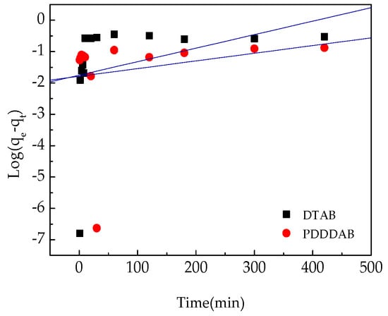 Pseudo-first-order kinetics for Cr(VI) onto PDDDAB-AC and DTAB-AC.
