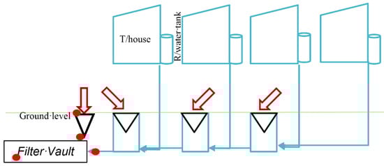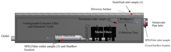 Roofwater is initially captured by rainwater tanks which supply water for internal and external townhouse use, with overflows plumbed into the underground drainage upstream of the filter vault, entering the system beneath the pit baskets. Grated inlets (catch basins) capture surface runoff from the site, carrying it to an underground vault containing the media filter cartridges after passage through inlet pit basket inserts via the same underground drainage system receiving rainwater tank overflows. The concrete filter vault also provides a detention function prior to release of treated stormwater to Council drainage. The cartridge filters utilise a perlite, zeolite, and activated alumina media to provide treatment of stormwater pollutants. The site, monitoring setup, and protocol have been described in earlier publications [11]. A schematic cross-section of the monitoring installation is shown in Figure 2, and a schematic of the site and stormwater network is shown in Figure 3.