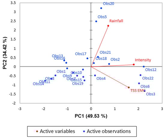 Principal component analysis (PCA) biplot for observed event data for rainfall depth, intensity and TSS event mean concentrations (EMCs).