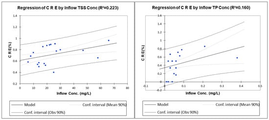 Principal component analysis (PCA) was performed on the inlet TSS, TP and TN concentrations to investigate possible correlations to event characteristics. Confirming the findings of previous research, PCA evaluation has concluded a significant, positive relationship between rainfall intensity and influent TSS concentration, with a weak, positive relationship to rainfall amount [21]. The PCA biplot is presented in Figure 5. Influent concentrations of TP and TN did not display significant relationships to either rainfall depth or intensity. Regression analysis confirms that 22% of the CRE variability for TSS and 16% for TP is explained by the inflow concentrations, as presented in Figure 6 (90% confidence). Further correlation tests were performed to evaluate potential relationships between CRE and rainfall depth or peak intensity. The analyses concluded that there was no significant correlation to rainfall depth. Peak rainfall intensity was observed to explain between 5% and 11% of CRE variability but was not statistically significant.