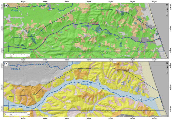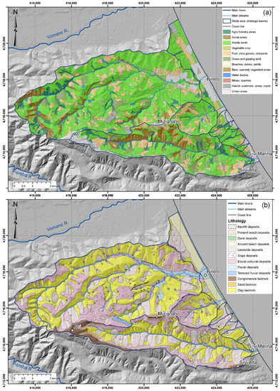 Lower Salinello area: (a) land use map (modified from land use map of the Abruzzo region [64]) and (b) lithologic scheme (legend is in Figure 4, grid in UTM WGS84 coordinates).