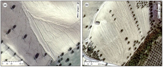 Geomorphological effects induced by the 2007 heavy rainfall event in the Tortoreto hilly area (ortophoto taken 2 days after the event): (a) gully erosion and (b) rill-gully erosion features.