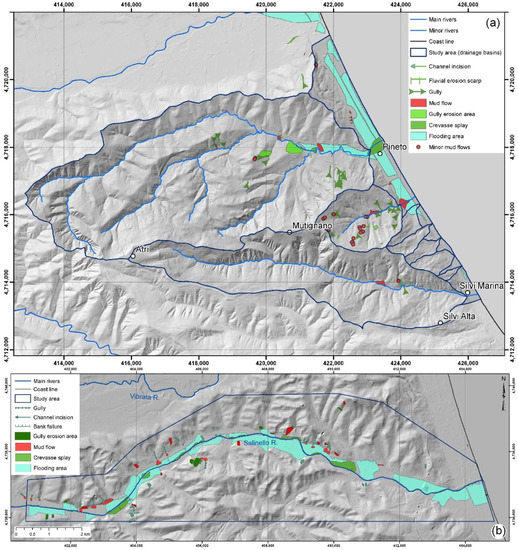 Map of the geomorphological effects triggered by the 2011 heavy rainfall event (grid in UTM WGS84 coordinates): (a) Atri-Pineto hilly and coastal area (Pineto 2011) and (b) Salinello River valley (Salinello 2011).