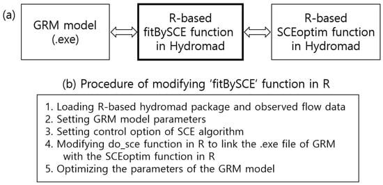 Conceptual diagram of the combination of the GRM and the SCE algorithm in R. (a) is the schematic of the combination of the GRM and the SCE algorithm provided in the hydromad package. (b) is a brief description of the procedure for modifying the link code in R.