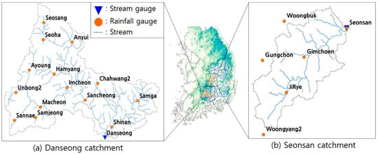 In this study, the Danseong and Seonsan catchments, which are major tributary catchments of the Nakdong River in South Korea, were selected for the calibration of the GRM, as shown in Figure 2. The area of the Danseong catchment is approximately 1710 km2. Most regions in the Danseong catchment have steep mountains (approximately 73%), and agricultural land is distributed near the mountain stream (approximately 21%). The area of the Seonsan catchment is approximately 980 km2, constituting approximately 65% of low mountainous area. Moreover, the farmland is relatively flat (approximately 28%) throughout the catchment, except in the mountainous regions. The Seonsan catchment is flatter than the Danseong catchment but is relatively closer to natural catchments and includes an urban area of approximately 4% of the catchment area.