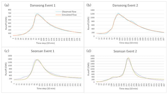 Observed and simulated hydrographs for parameter calibration periods. (a,b) show the observed and simulated flow of the rainfall event 1 and 2 of Danseong catchment, respectively. (c,d) show the observed and simulated flow of the rainfall event 1 and 2 of Seonsan catchment, respectively.