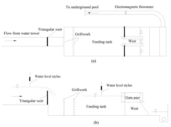 The head of the right-angled triangle weir is measured by a water level stylus, which is installed 1.0 m upstream of the weir, and the accuracy is 0.1 mm. The water level of the reservoir is also measured by a water level stylus with accuracy of 0.1 mm. The water level gauge point was set at the side of the feeding tank (or reservoir) and is 2 m away from the inlet of the finite-crest length weir. Figure 1 shows the experimental setup.