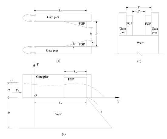 Definition sketch of the finite-crest length weir with FGP (Flaring Gate Pier): (a) plane view; (b) front view; (c) side view (Lw—the length of the weir, Lp—the length of the FGP, B—the width of the weir crest, b—the width of the weir outlet, P—the height of the weir, H—the head of the weir, V0—approching velocity).