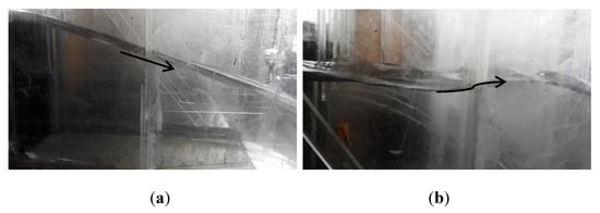 Photograph of water surface: (a) without FGP; (b) with FGP (β = 0.51, θ = 15°) (Black arrow stands for the flow direction).