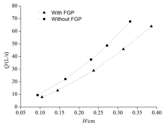 Head–discharge relationship of the weir for the cases with FGP (β = 0.51, θ = 15°) and without FGP.