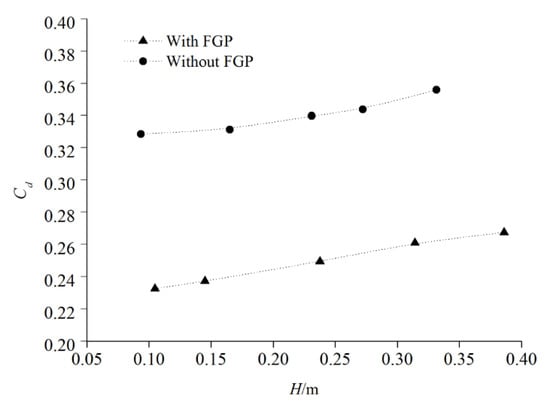 Considering type 3 of the finite crest-length weir as an example, Figure 6 shows the head–discharge relationship of the weir for the cases with and without the FGP. The two discharge-stage curves, with slightly similar change rules, were both concave in shape. However, the curves for the weir with the FGP were always below that of the case without the FGP, which indicated that the discharge was reduced when the FGP was installed on the weir. The discharge coefficient Cd was the indicator of the discharge capacity of the weir, which was defined as follows [2]: