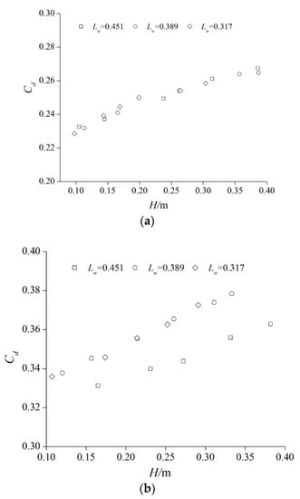 It also could be seen that the distribution rule of the three Cd–H curves without the FGP was different from the aforementioned regularity. Two Cd–H curves for Lw = 0.389 m and Lw = 0.317 m almost overlap just above the one for Lw = 0.451 m, as shown in Figure 8b. It indicated that the discharge coefficient of the weir without the FGP increased as the weir length decreased in a particular range, but gradually tended to stabilize when the weir length continued to decrease.