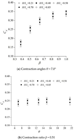 In the present experiment, the range of H/Lw was approximately 0.187–0.909. Keeping the other parameters constant and varying one parameter, the effects of β and θ were shown in Figure 9. Figure 9a shows the variations in Cd with β for each H/Lw at the same contraction angle θ. As indicated in the figure, the discharge coefficient significantly increased as the contraction ratio increases (0.38 ≤ β ≤ 1). Figure 9b illustrates the variations in Cd with θ for each H/Lw at the same contraction ratio β, which indicated that the discharge coefficient changes only slightly as the contraction angle increases 7° ≤ θ ≤ 21.5°.