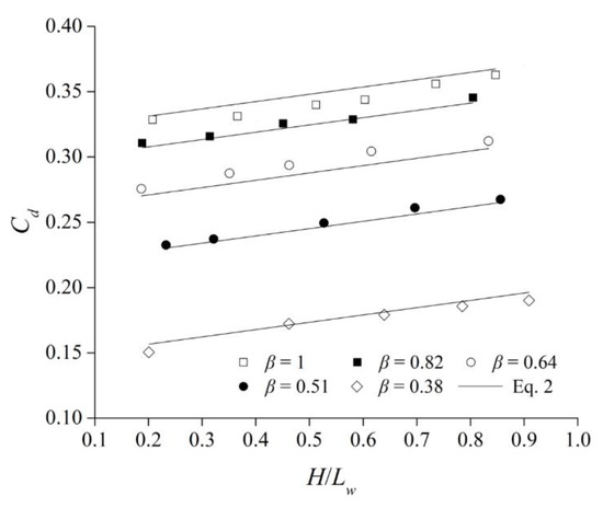 Consequently, H/Lw and β were the dominant parameters of the discharge coefficient of the weir with FGP Cd. By the linear regression method, Equation (3) is obtained. The correlation coefficient R2 is equal to 0.967, which shows that the accuracy of Equation (3) is higher. The relationship between discharge coefficient Cd and the two parameters described using Equation (3) is shown in Figure 10.