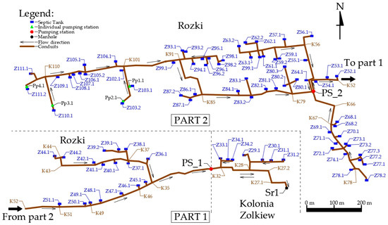 The research was carried out on an active reference object of an SDGS system along with a wastewater treatment plant, built under the project Demonstrator + in the Zolkiewka commune (Lublin province). The system was built in 2015 in the villages of Kolonia Zolkiew and Rozki. A scheme is shown in Figure 1.