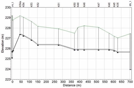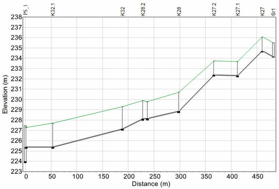 The studied SDGS system was made of PE pipes of diameter DN 63 mm (Din = 55 mm) and lateral connections made of PE pipes of diameter 50 mm (Din = 44 mm). The network worked generally as gravitational, but in some parts it could work alternately as gravitational or pressure. Two pumping stations on the network were installed. This network serves 86 households. The main profiles of this system are shown in Figure 2 and Figure 3. Invert depths, i.e., the vertical distances between the ground elevation and the pipe invert at a given node, ranged from 1.2 m to 3.4 m.