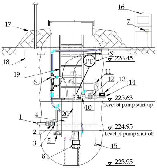 Wastewater pumping station PS_1 according to the design project. Legend: 1—Inlet PE 63 mm; 2—Valve; 3—Check valve; 4—Vacuum tank; 5—Check valve; 6—Float switch for vacuum pump; 7—Vacuum pump; 8—Submersible pump; 9—Pressure transducer; 10—Check valve; 11—Emitter with almost closed valve; 12—Valve; 13—Ultrasonic flowmeter; 14—Outlet; 15—Measuring bell; 16—Control cabinet; 17—Bank; 18—Biofilter; 19—Ladder; 20—Electric cable.