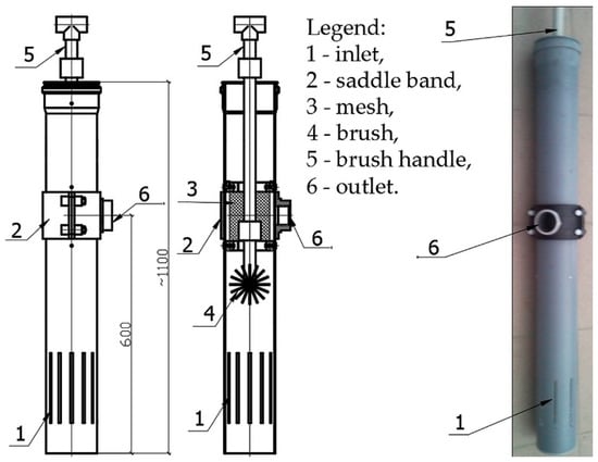 All 86 homesteads had their own septic tank (ST). Every septic tank in the reference system was constructed of concrete rings of diameter 1.2 m. The depth of these STs associated with the outlet of wastewater to the network was in most cases 0.9 m. The initial storage volume of the ST was therefore about 1 m3. Septic tanks were equipped with innovative fittings in the form of effluent filters (Figure 5) and floating-ball valves (check valves) (Figure 6). The floating-ball valves acted as check valves and prevented air from entering the system. These valves were installed mainly at the outflow from unfavorably low-laid ST or connected to the force main (PS_2-PS_1; PS_1-Sr1), which could be flooded with wastewater from the network during the period of emptying an ST located more favorably or during the work of the pump in the pumping stations (PS).